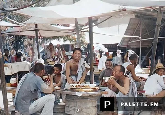 图里这片遮阳布和竹架子拼起来的叫凉棚,竹竿打十字,顶上铺草席或帆布,边上再用细绳拉住,风一过嘎吱作响却不散架,桌子多半是旧木板拼的圆桌,底下垫着大木桶或石墩,当年街口一搭,立马就是个清凉小天地。
