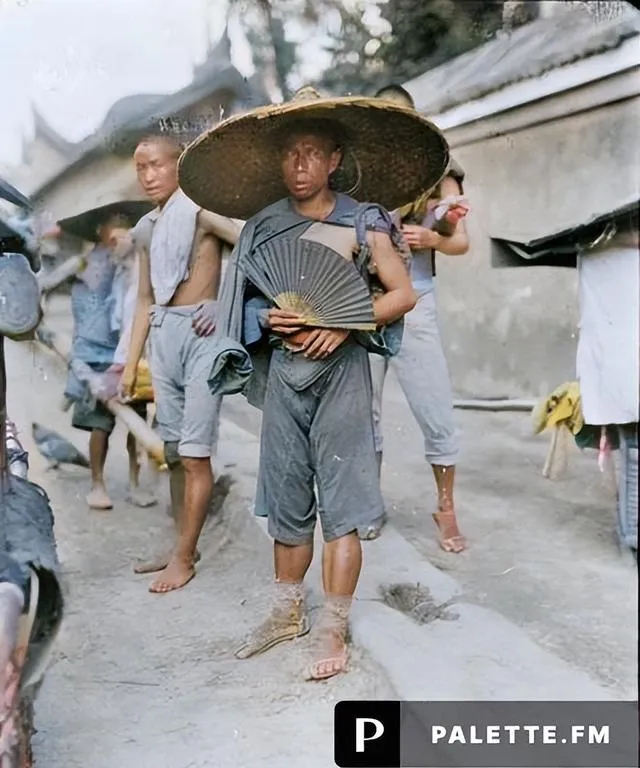 这个大草帽叫斗笠,竹篾做骨草绳打结,边沿压得宽,搭在眉上影子能盖到胸口,脚下是草鞋,麻绳绕脚腕打个死扣,走土路不打滑,手里还得攥把折扇,黑亮的扇面一合一展,啪嗒有脾气。