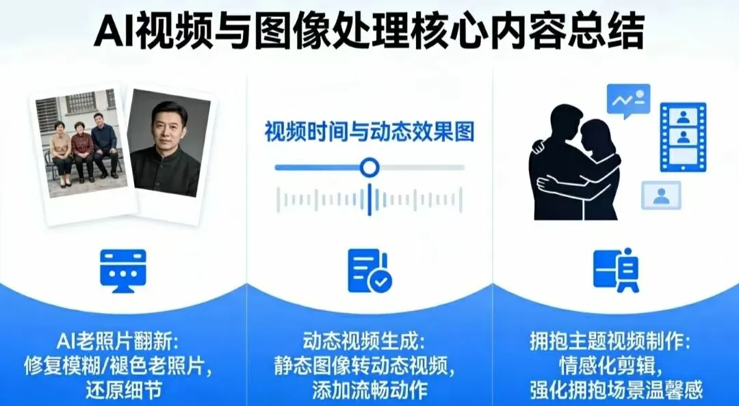 附免费工具 + 保姆级教程,把时光里的回忆揉进温暖瞬间翻开相册,那些泛黄卷边的老照片里,藏着最珍贵的时光:父母年轻时的笑颜、爷爷奶奶的牵手合影、小时候攥着糖果的懵懂模样,还有那些再也回不去的陪伴瞬间。总想着,要是这些画面能动起来就好了,要是能和照片里的人来一次拥抱就好了。现在 AI 真的能实现这份心愿!不用专业技能,不用花钱找设计师, 免费工具 + 几步操作 ,就能把模糊的老照片高清翻新,一键做成动态视频,甚至能生成超暖心的「拥抱你」专属视频 —— 和逝去的亲人隔空相拥,和远方的长辈温柔牵手,让时光里的温暖,变成触手可及的画面。今天就手把手教你,从老照片翻新到生成拥抱视频,全程零门槛,看完就能做,快把家里的老照片翻出来,让回忆 “活” 起来~老照片难免有褪色、划痕、模糊的问题,先做好翻新修复,后续的视频效果才会更棒!这一步选 免费、零门槛、效果自然 的工具就够了,实测多款后,这 2 款闭眼冲,新手秒上手。✅ 主推工具 1:复活老照片 APP(新手友好 TOP1)全网实测的新手首选, 免费无套路、无水印、一站式搞定所有问题 ,不用调任何参数,10 秒出结果。 核心优势 :自动去划痕 / 去黄 / 去模糊,黑白照上色贴合年代感,不会过度磨皮,完美保留老照片的原有质感,还支持画质增强,连发丝、衣物纹理都能精准还原。 实操步骤 :- 应用商店下载 APP,打开后无需注册,直接点击【一键修复】;