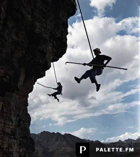 图中这身法叫“溜绳”,粗麻绳绕腰,脚蹬钩,身子贴着石壁飘着走,下面是万仞深谷,上面是未劈的岩,锤子一抡,火星一簇,胆量就这么一点点练出来,后来再说怕高,谁都不信了。