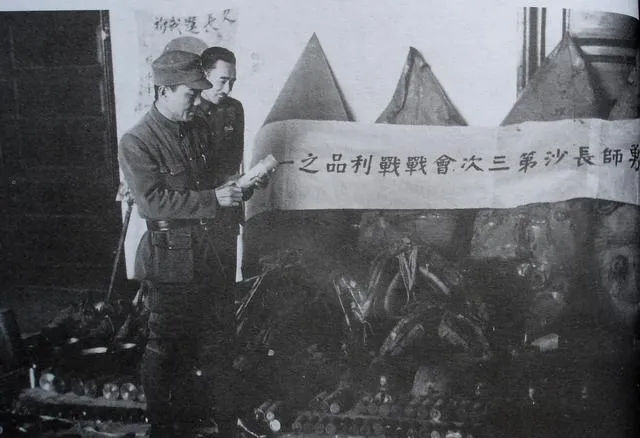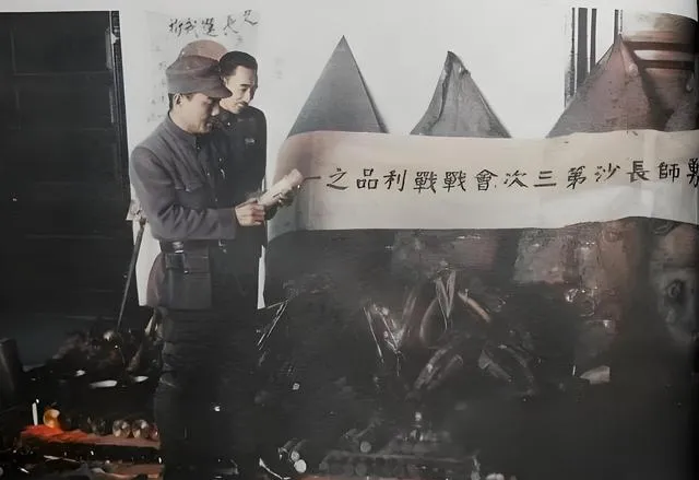 图中堆得像小山的铁疙瘩叫缴获物资,炮弹壳、步枪、望远镜、通信盒子一溜排开,白布横幅上写着“长沙会战战利品”,兵士拿在手里的是拆开的炮弹引信,指头上还沾着油污,灯光一照,金属泛着黄亮的边儿。