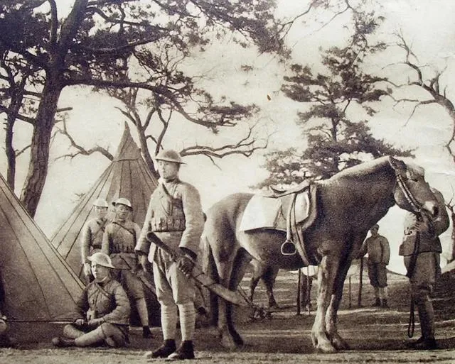 同一组的黑白版更有年代感,帽盔的亮面被光压成一块白,马眼半眯,像在打盹,爷爷看见这类照片总要补一句,说骑兵一口气能跑三十里,回营就靠在帐杆上睡一会儿,醒来又能冲出去。