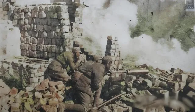 这个砖堆后面的小口叫机枪射孔,石块不规则垒成的,泥灰还没干透,机枪架三脚摊开,装水的冷却套冒着潮味,射手贴在托底,副射趴得很低,烟雾把背景全糊住,耳边只剩哗啦啦的砖滚声。