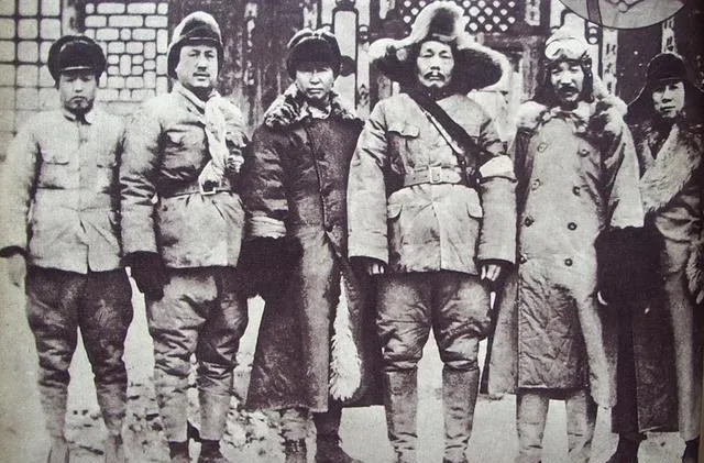 这排穿得鼓鼓囊囊的叫绥远冬装合影,皮草领子两边翻起,扣眼子很大,手背露出来是红的,呼出的白气在镜头前飘一层,站在中间那位胡子结霜,脚下的毡靴踩得地上雪都塌了。