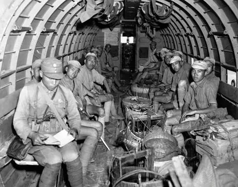 图中这排窄窄的座位叫折叠长凳,铝框加帆布,沿着机舱两侧一字排开,士兵挤着坐腿上还压着背囊,肩带在锁骨上勒出一道白印,老兵说这凳子颠得狠但比站着强多了,飞机一抖,水壶相碰叮当响,谁也不喊苦,想着一会儿就要落地了心头还热。