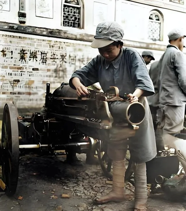 这个金属家伙叫九二式重机枪,握把像两只牛角,拉机柄往后一拽,弹链哗啦啦顺槽下去,图中少年的手腕细,指节抹着机油发亮,他不说话,眼睛只盯着机匣,老师傅在旁边念叨两句,别憋气,枪响才算修好。