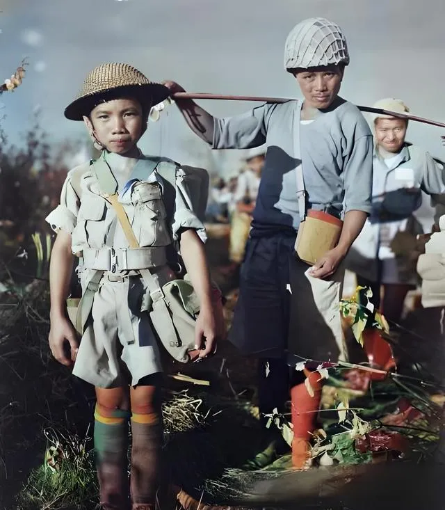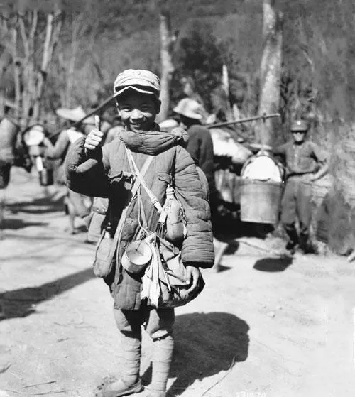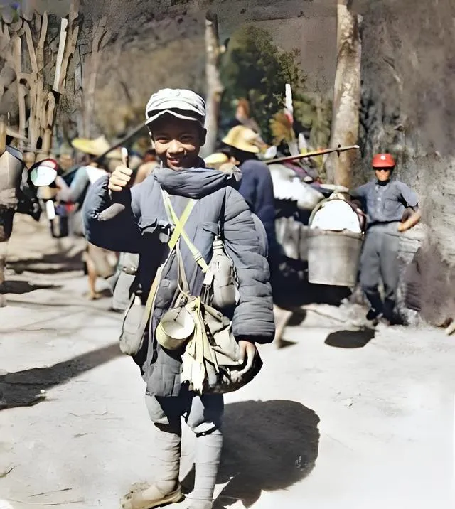 这张里最显眼的是牛皮挎包和铝饭盒,扣子一按就弹,饭盒挂在胸前跑起来直打颌骨,这孩子冲镜头竖起大拇指,像给谁打气似的,后来我才懂,能吃上热饭就是好消息,别管菜里是不是只有两片咸菜。