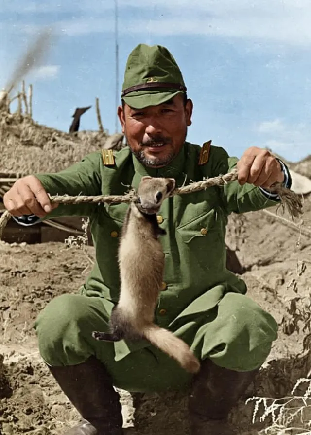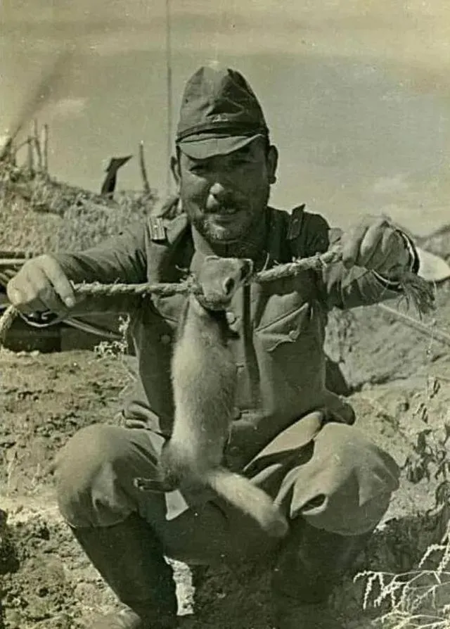 图中这根麻绳上吊着的是一只黄鼠狼,照片里的那个军官笑得很随便,军服是硬挺的绿色,上衣口袋鼓起,金属领章在太阳底下发冷光,手臂把绳子撑成一条直线,像展示战利品一样,乡野土坷垃干裂着,远处茅草屋顶歪斜,光是这些细节就够刺眼了,兽行往往不需要太多语言,表情已经说尽一切。