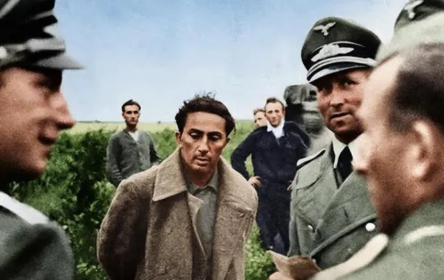 这个神情叫疲敝,图中年轻人外套松垮,领口露出里衫,头发乱得像刚被风掠过,眼神垂着却发硬,周围的制服把他围成一个小圈,肩章和鹰徽扎眼,草地上的影子斑驳,像碎玻璃一样割脚,他被当筹码,他们在盘算,可他自己像块石头,谁也搬不动。