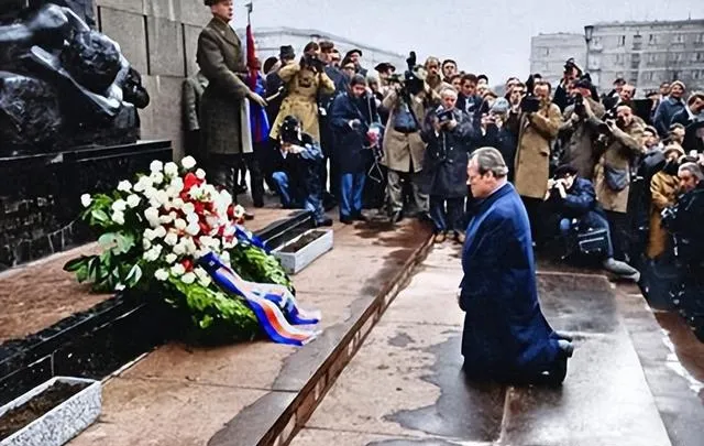 这个动作叫下跪,地面湿得发亮,花圈一层一层叠在碑前,白花边上挂着水珠,围着的人举相机的举相机,握枪的也没出声,跪着的那个人穿深色大衣,肩膀微微往前坠,整座城市像是屏了一口气,这一跪不声不响,却很重。
