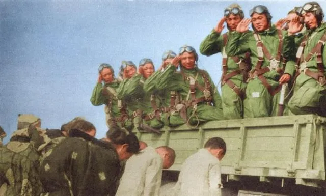 这个队列叫出征前的合影,飞行头盔压着额头,护目镜斜挂在帽檐,绿色跳伞带一道道勒在身上,车厢木板还带着新刨过的毛刺,几个人端着所谓的敬礼,下面一群人鞠着躬,场面齐整,却冷得很,谁都知道他们要去干什么。