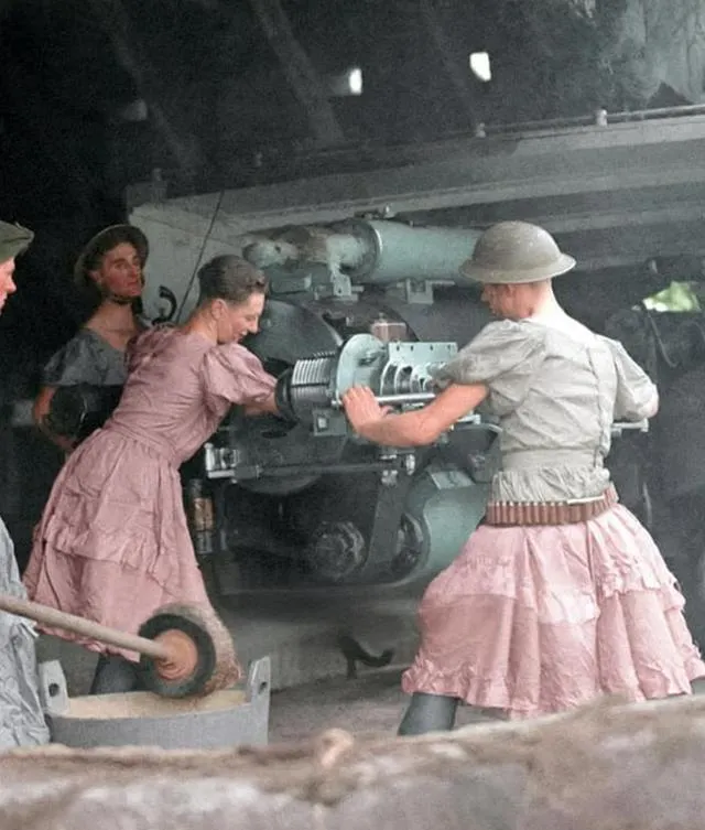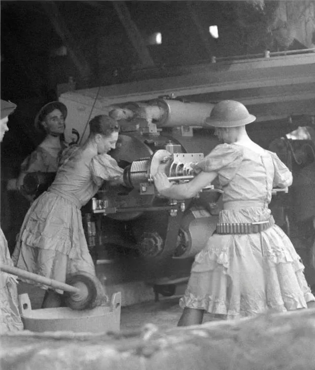 这张照片里穿着裙子的人在推炮机,裙摆是起皱的浅粉色,腰间配着弹链,头上还顶着钢盔,胳膊上青筋绷起,炮膛被擦得亮亮的,旁边有人拿着长杆,动作熟练得像上了台的戏子,荒诞不,荒诞,可敌机一来,谁也不含糊。