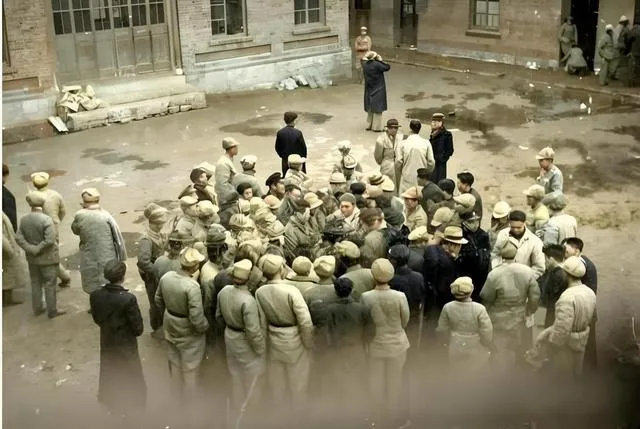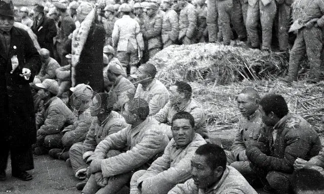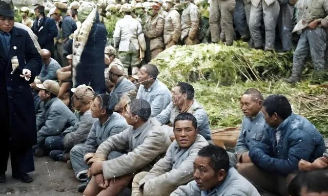 图里这一圈坐在地上的叫押俘队列,身后码着新割的草垫子,前面有人拿着本子点数,袖口上挂着一枚标记卡,爷爷说有时候还要摆个“俘虏营”样子给人看,人数要对上,表情要严肃,镜头一来,谁也不许乱动,有个年轻的小伙子偷偷把棉裤往上拽了一把,怕坐在湿地上渗冷,他抬眼看了一下镜头,又很快低下去。