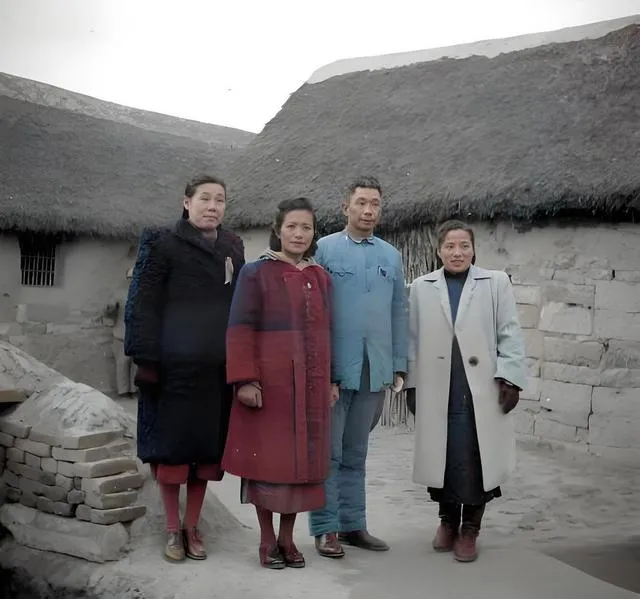 这张合影胸前别着的叫徽标绶带,窄窄一条,尾角剪了燕尾,四个人站在垛口边,墙是石块垒的,缝里塞着草,脚下是土台子压实的硬面,男人穿了一身浅蓝对襟,袖口一抬,露出手腕上的冻疮疤,女人们的外套颜色厚重,边缝出一道粗线,拍完照她们往屋里走,风从门缝里吹出来一股柴草味,奶奶笑着说女人脚下那双红底布鞋可讲究,逢年过节才穿。