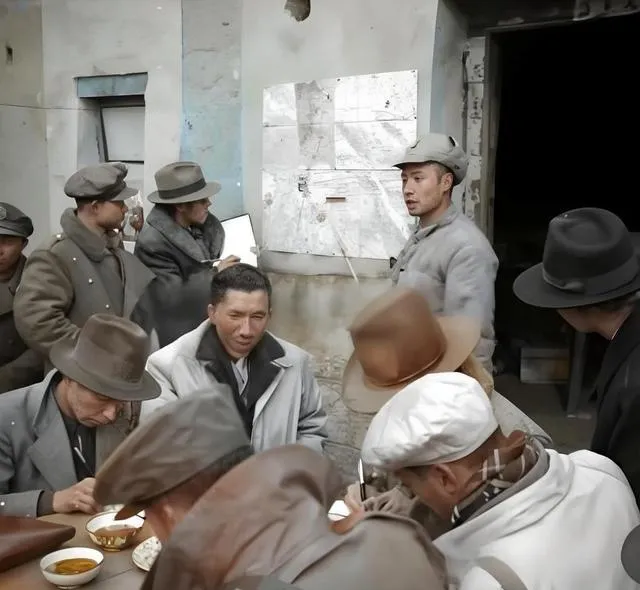 这个贴在墙上的叫临时战术图,用蓝红铅笔划的线交错着,边角用图钉钉得歪歪扭扭,拿教鞭的小伙子说着说着就把教鞭在图上一点,声音“笃”一下,像敲木板,旁边一位戴呢帽的在抿汤,碗里飘着两片葱花,另一位翻着皮质笔记夹,纸页边已经卷起毛刺了,奶奶看得直摇头,说这像不像在院里摆流水席,只是桌上不是菜,是地图和文件。