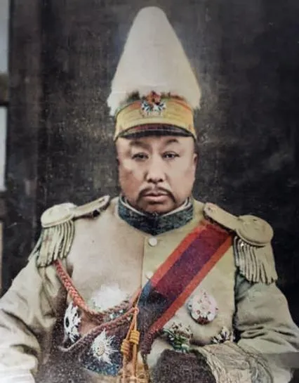 图中这位穿军服的硬汉坐得端正,这身行头叫呢料军装配勋章绶带,肩头有流苏式护肩,胸前压着多枚金属章,红蓝黄三色斜跨的绶带从肩头落到腰侧,呢面发挺,缝线有板有眼,帽檐上嵌着金属徽饰,顶上还立着一撮白色高冠,像把旗子立在头上,远远一看就知道是个带兵的主儿。