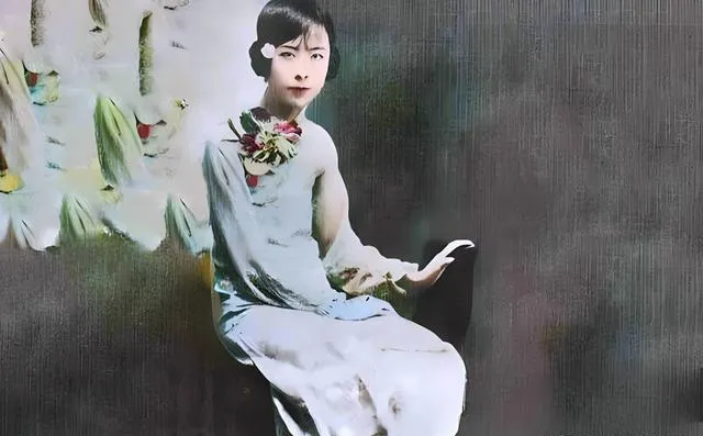 这个端坐的女子穿的是丝绸旗袍裙,肩口夹着一朵绢花,颜色淡得像刚化开的牛乳糖,袖口贴边细细的,手指搭在椅沿上,细白一截,最有味道的是她脸旁那枚小小的白花发饰,像把光点别在鬓角上。