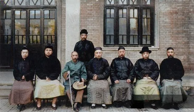这张多人合影里的衣服很齐整,统一的长袍马褂,颜色从墨黑到灰青,坐着站着都老老实实,屋后的砖墙和长窗把人衬得更正经,前排那位手里捏着一顶礼帽,亮皮沿在彩色底片里蹭出一点光。