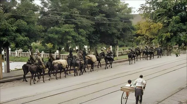 这张街景里最显眼的是骡马队,鞍上驮包一捆一捆,尾巴甩着尘土往后掠去,路边的电车轨在阳光下亮得发白,后头有辆人力车跟着跑,车夫身体前倾,双臂紧绷,像一条弓拉满了弦。
