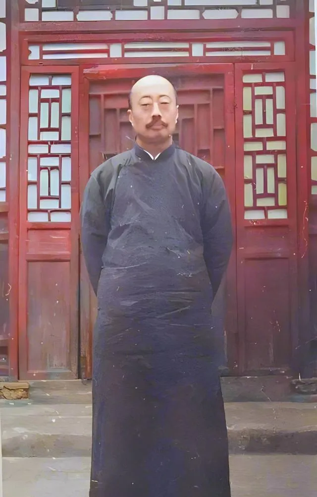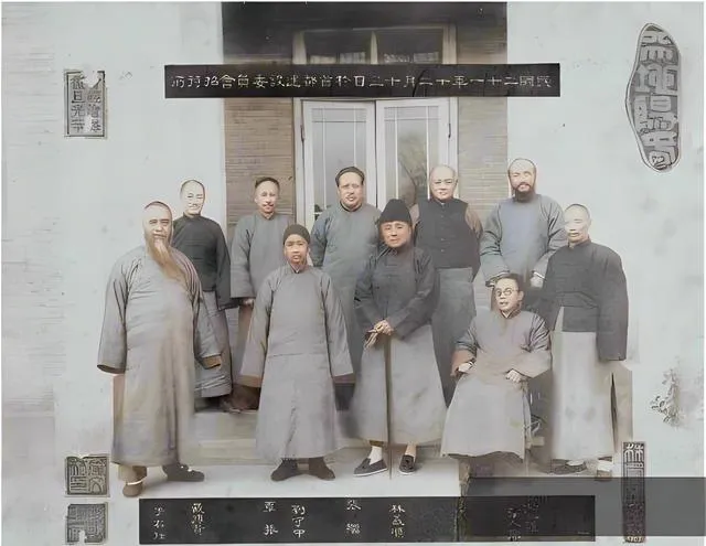 最后这张门阶上的合影,衣裳并不统一,黑蓝灰里夹着几抹淡色,最左那位的长须垂到胸前,最右有人坐着,手扶着椅把,脸色淡定,门楣上横着一条黑底金字的牌匾,字迹硬朗,像从石头里刻出来的。