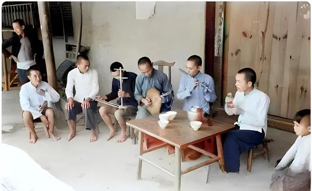 这个场面热闹,图里这堆器物各有叫法,二胡、竹笛、堂鼓、扬琴架子,摆在堂前的八仙桌上还有盖碗茶,几个少年光脚坐木凳,胳膊一抬就有曲子,老叔常说,会不会不要紧,合不合在一处才要紧,逢年节请亲戚,先上两段小调压住场,吹久了手心会出汗,竹笛就更亮,敲鼓的孩子偷着笑,怕打重了吓着里屋的太太。