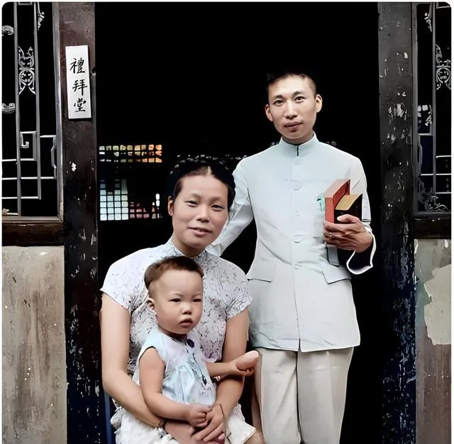 这张合影靠在门楣下,侧联写着礼拜堂,先生一身浅色长衫套西式立领,腋下夹着两本书,太太抱着孩子,衣料细密,扣子光润,笑意不夸张,站姿却有板有眼,1940年前后就是这个劲儿,新学进门,老礼未散,爷爷看这种照片就打趣,说读书读到穿得利索,是好事,但记得回家要把书放下,先跟长辈请安。