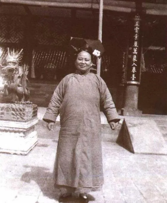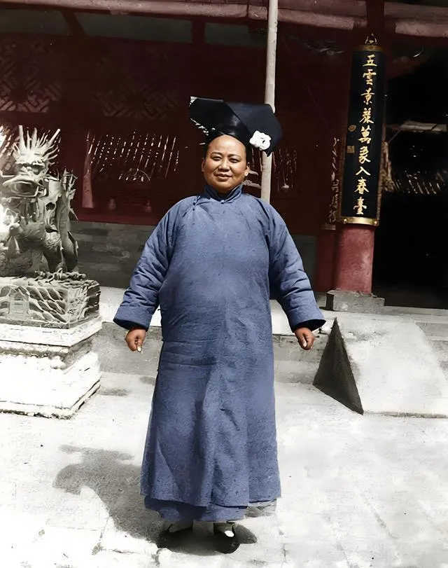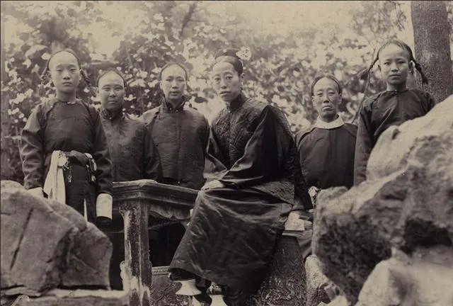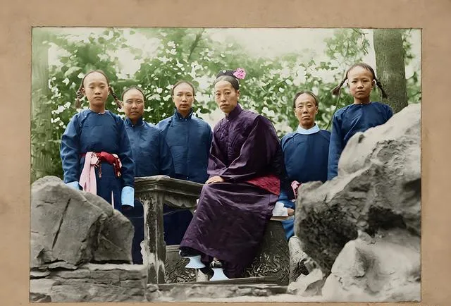 图中这位端坐石几上的,是隆裕太后,两侧立着随侍太监,蓝灰色长衫贴身,袖口齐整,脸上的神情不谄不媚,像极了御前的影子,石栏纹样老道,枯山石把人衬得更静,太后衣袍厚重,暗纹压得住气场,发边插花,细小却不掉,皇城根儿下的规矩全写在姿态里了。