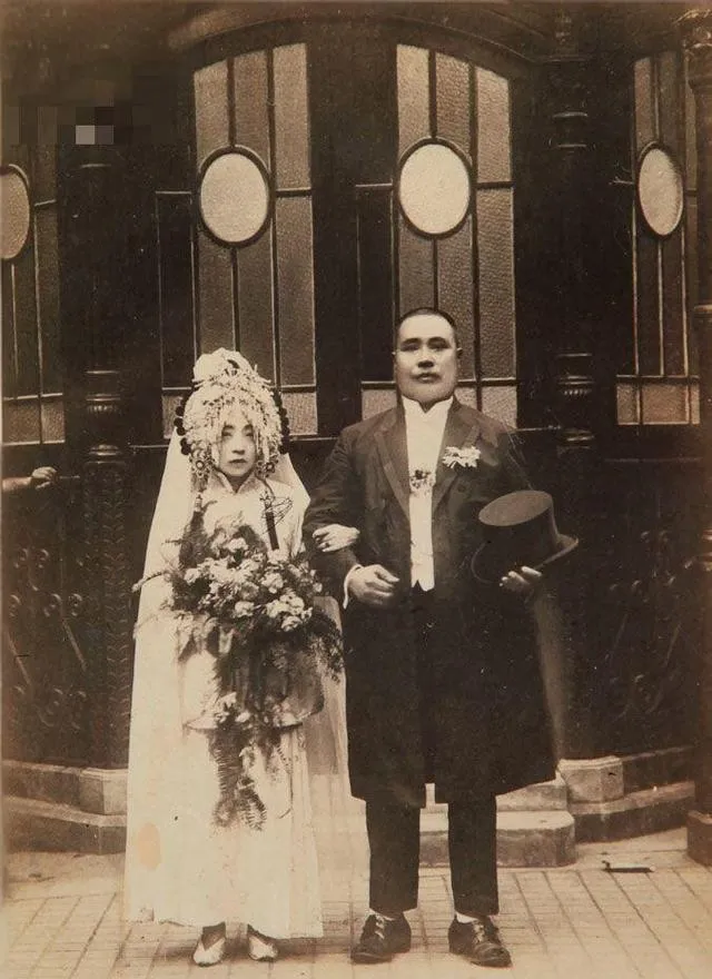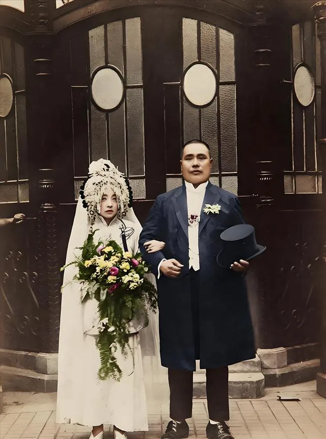 这张洋门前的合影,赛金花穿西式婚纱,头顶一簇一簇珠花,手捧超大的捧花,旁边的魏斯炅穿全套礼服,手里举着高顶礼帽,姿势夸张,站得直,别看布景洋气,镜头味道还是老底子的,发光的玻璃门一格一格,像给两人钉了框。