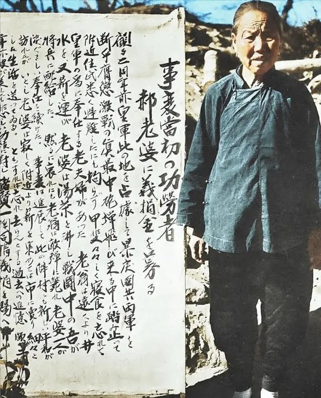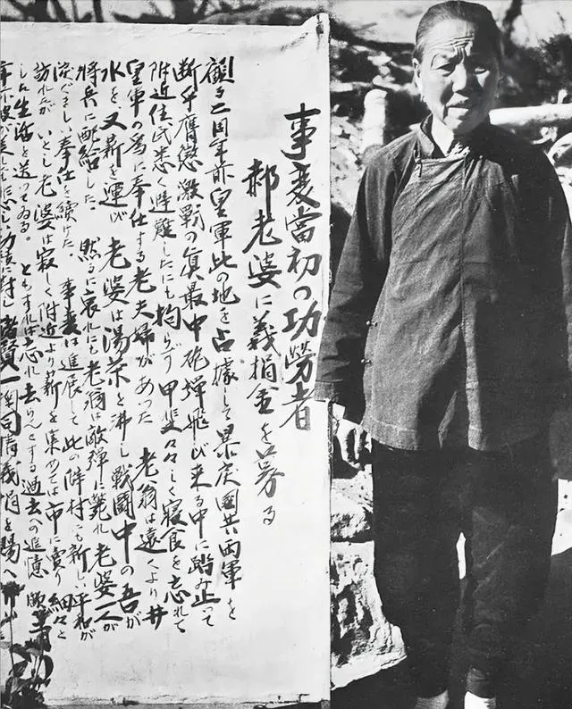 这个布告旁的人被叫作郝老太,边上那块板子满是日文夸功劳,字写得密不透风,她站在阴影里,衣襟皱着,手插在袖里,神情飘忽,照片宣传味足,隔着年代看都膈应,战争一来,人心就见高低,这种光鲜的“功劳”,一阵风过就凉透了。