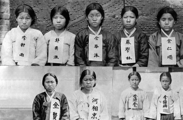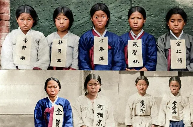 这一排胸前挂名的,是朝鲜半岛女性独立运动者,韩服上衣短,裙子长,颜色深浅搭着,脸上都还带着稚气,站成一排眼神倔,名字牌垂在胸口,像一面小旗,风一吹就轻颤,那会儿被捕也要站直,拍的人想要羞辱,结果把她们的硬气拍了个正着。