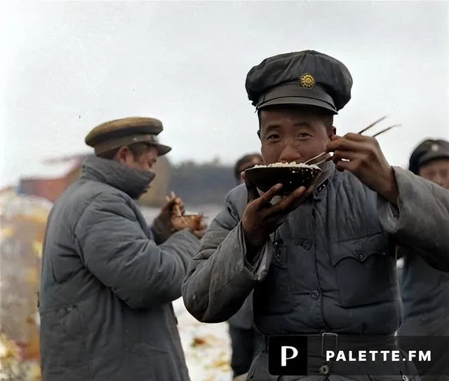 我小时候跟着长辈看黑白片段,里面的人也是这么端着碗,嘴里呼呼吹气,后来有了彩色照片,才知道那一口饭也能这么亮,米粒在光里发着白,边吃边看岗哨,筷子一停,眼睛先往前瞟,那种紧着过日子的劲儿,照片替他们留住了。