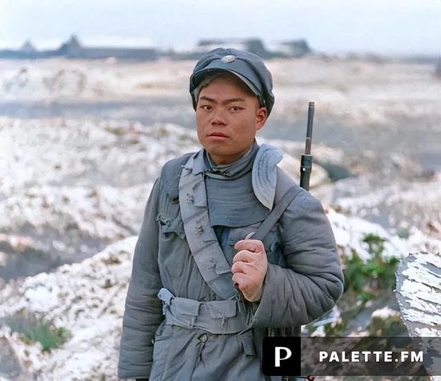 这位年轻兵的棉衣打着补丁,胸口别着布签,肩上背带勒出一道痕,手指握着背带头,指节冻得粗粗的,枪管从肩后露出一截黑光,他没摆姿势,站在风口上,眼睛里全是硬气。