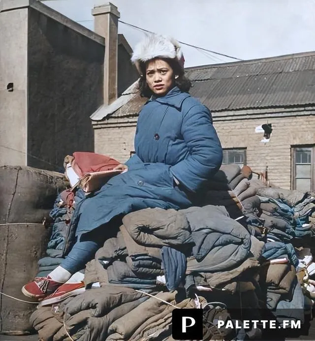 这堆鼓起来的全是行军被,外面用麻绳横竖勒着,女孩坐在最顶上,蓝棉大衣把人团成一团,白皮帽压着乱发,鞋帮红得鲜亮,她眼神像在找人,也像在等命令,妈妈说,那个年代年轻人上阵快,笑也快,愁也来得急,天一黑还得把这些被褥分到各连。