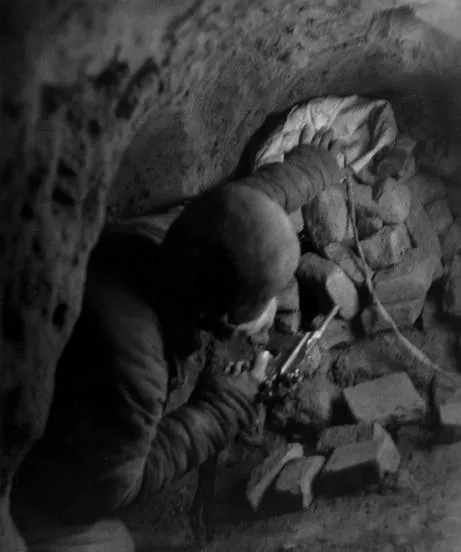 图中拱起来的长廊叫主干道,墙面抹得顺溜,能让两个人侧身擦过去,前头那小伙扛着木柄,像是简易撑杆,用来顶住翻板门,走在里面潮气往袖口里钻,灯一远就黑,后脚跟总怕踩空,这条道能从堂屋连到猪圈,再转到麦秸垛下的出口,走熟了闭着眼都不怕。