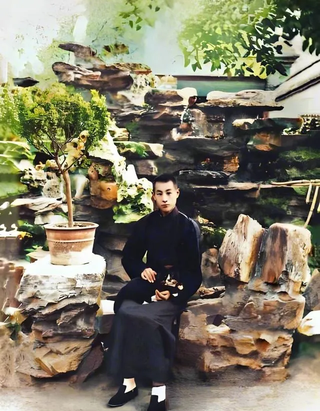 这个坐在假山前的小青年,穿的是乌青色长衫,腰间扎得平整,手里抱着一只猫,黑白的毛,眼睛亮晶晶,鞋面布料细密,露一截白袜,整个人清清冷冷的气息透出来,周围石头叠着石头,瓦罐里一株小树,叶子抖得很精神。