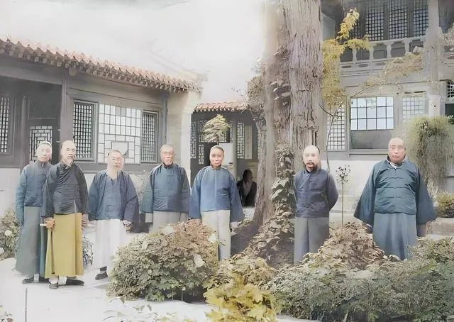 这张合影里的人不少,站在院落里,背后是梁枋窗棂,树干粗得要两个人合抱,衣色以青蓝为主,间或有一抹鹅黄,衣摆宽,袖管也宽,风一吹能拢出圆影,名字就不一一数了,反正都是那个年代绕不开的角色,学问也好仕途也好,站成一排,谁也不抢谁的光。