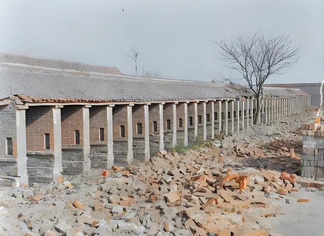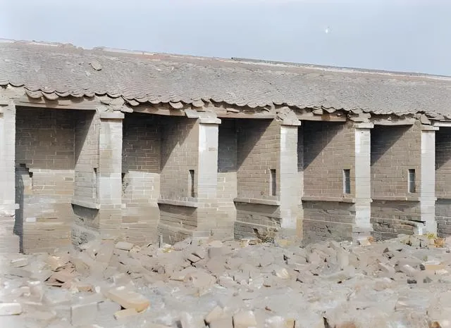 图中这一排低矮的格子叫号房,考场里士子的临时栖身之处,青灰的砖墙被风打得起毛,白色立柱一根挨一根,像还在维持最后的体面,脚下全是碎砖烂瓦,走一步嘎吱一响,像旧纸被折了一道折痕,奶奶说当年贡院迁到城东北的时候,这样一格一格的房间最怕春雨渗,考生把蓑衣当门帘一挂,冷风还是要往里钻,写到手指发硬,依旧不敢抖一抖笔尖,怕错了字儿就把命运写歪了。