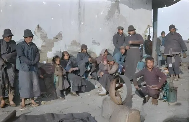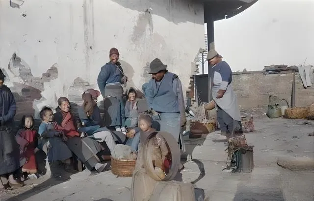 这个角落里坐着的一群人,当年叫流民,墙皮脱落,篮筐靠脚边,几顶破毡帽一起把风遮了半边脸,他们靠着墙根晒太阳,手上没有活计,就把空当晾在脸上,孩子缩在大人衣襟后面看热闹,笑意是从冬天里挖出来的一点火,妈妈看照片的时候嘟囔了一句,说那会儿人穷得紧,可只要凑在一起,锅里能有口稀粥,心也能暖一半。