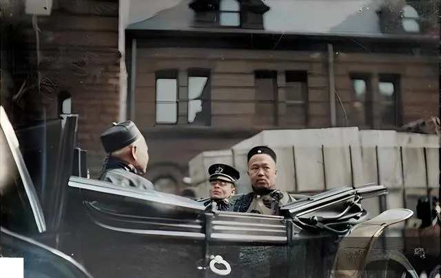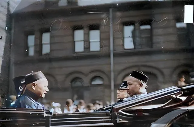 图中这位穿儒服坐在敞篷车里的先生叫康有为,那会儿他已流亡到美国的芝加哥,车身是亮黑的,边上镶着金属条,阳光一照,像刀口一样亮,他身边有人戴呢质礼帽,后座还挤着穿制服的人,脸上带着那种既警惕又好奇的神情,这种场面在当时可不多见,城里街面宽,石墙楼房的窗子高高的,围观的人把影子投在车沿上,像水波一样晃。
