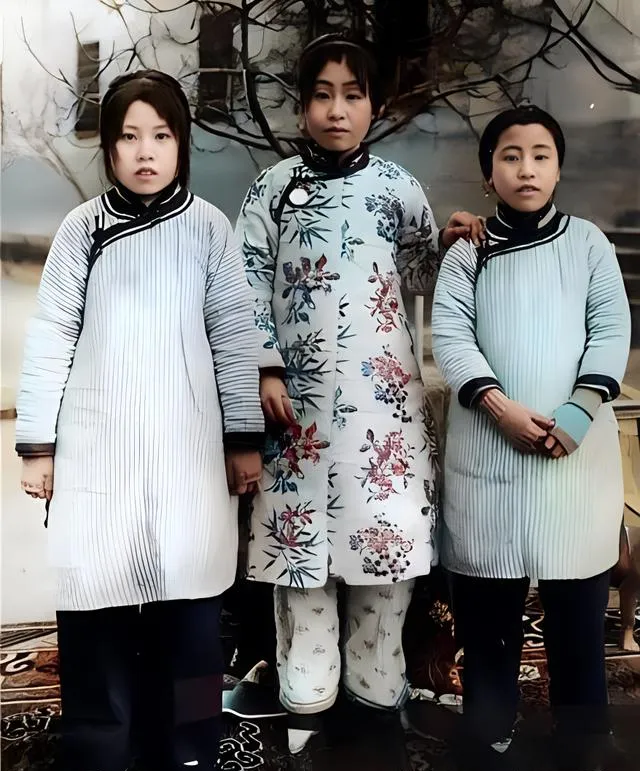 图中这张屋里拍的叫闺阁合影,中间的千金穿白底花草长袄,袖口压得平整,左右两位女伴衣色素雅,袖口里露出毛线手套,冬天的冷从这双手背上就看出来了,地上铺着带花纹的毯子,背景是画出来的枯树和远山,摄影馆的老手法,一半真景一半戏台。