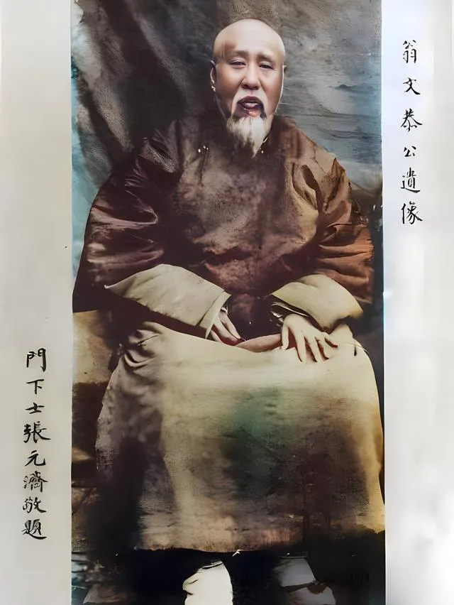 这个坐着的老先生叫翁同龢,两朝帝师,照片上他穿着暗色棉袍,右手搭着左手背,指节粗而白,胡须修得齐整,眼神是疲惫里带着清明,身后挂的是布幕,边上写着字,笔意挺直,落款是徒弟敬题,他的一生转折很多,支持变法那阵子得罪的人不少,后来被革职,这坐像里像是把一口气放下了,人软了点,眉却没松。