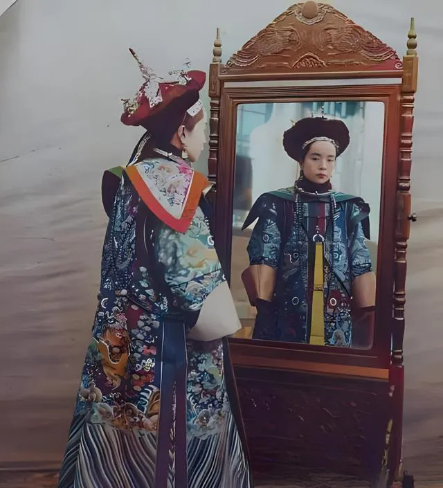 镜前这位穿蟒袍的夫人,正是那位权势人物的正室,也就是后来传说里川岛芳子的继母,桌镜是高背架,顶端雕着海水江崖纹,木纹温润,镜面里是她正面的脸,少年气里压着威仪,蟒袍的龙纹一层层压金线,肩头披肩像流动的水,袖口里衬了深色布,压住褶子,让边线利落。