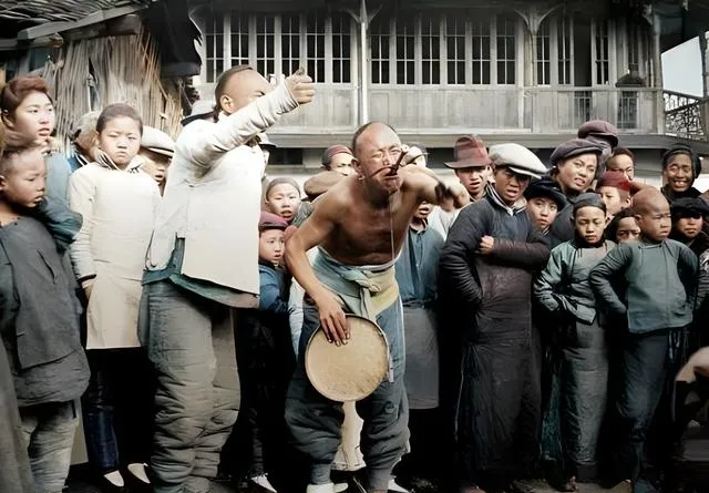 图中这个光着膀子的男人叫杂耍艺人,手里攥着铜锣片儿当节子,另一只手正往眼里穿针,围了一圈的看客挤成一堵墙,前排孩子脸都冻红了,伸着脖子不敢眨眼,艺人腰间系根破布带,胳膊上青筋鼓得像绳子,旁边的小徒弟吆喝着递道具,喊一嗓子就敲两下,叮当脆得扎耳朵,爷爷说,这一门行当靠的就是拿命换掌声,一口吞火,一把刀片往嘴里抹,观众叫好,兜里就多几文,没叫好啊,饭钱都悬了。