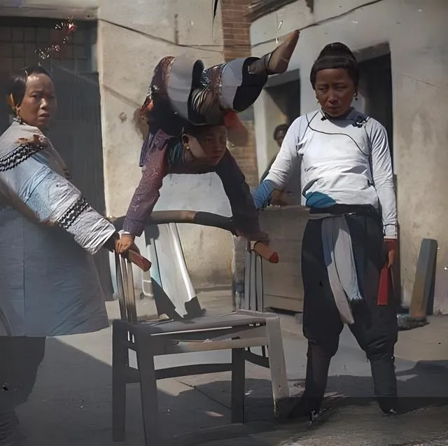 图中这把旧木椅叫演戏椅,腿粗条,靠背圆弧,椅面上蹭出一圈亮亮的包浆,中间那位女子两手扣在椅背边,手心压得稳稳的,身子一折就翻了上去,头往下,脚背绷直,像把倒挂的弯刀,旁边两位一左一右把着场子,手里各攥着小红手绢当节子,口里吆喝一声看位,街口的孩子们立刻围成一圈。