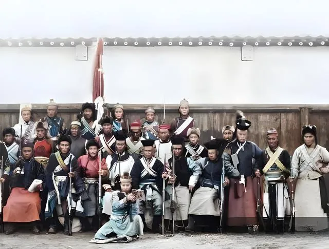 合影里的长枪短枪挨着站,队伍前排蹲着两个人,一人手里握着短管手枪,一人背着旗杆,旗面子皱着边,边上的鼓手把鼓棰夹在臂下,像刚落座还没拍点,照片一上色,衣褶的深浅就出来了,粗布的纹理清得很,旧时代的硬朗一下子立住了。