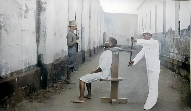 这个冷森森的家伙叫夹颈器,木台一座,前头一张窄椅,椅面磨得发白,侧边一根长螺杆,末端连着金属环,环口贴住人的喉结,执行的人一手握把,一手慢慢拧,螺纹一点一点推进,脖子被死死卡住,旁边的看守身上穿着笔挺的白制服,鞋头擦得亮亮的,整个巷道空空荡荡,墙皮起皮,风一过,沙粒刮得牙根发涩。