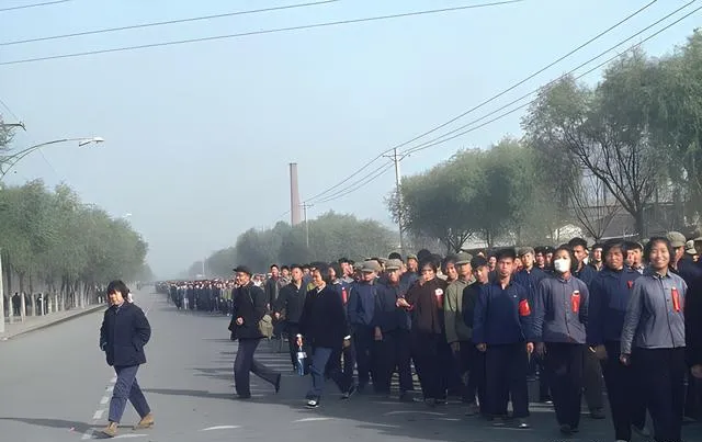 图中这条笔直的马路两侧是成排的杨树,远处一根高耸的烟囱直直插在天际,这种背景在六十年代太常见了,队伍里清一色的蓝灰衣裤为主,袖口上带着红箍的人领着口号,步子不快不慢,整齐得像一面流动的墙,人多得像潮水一样涌过来,空气里全是鞋底和尘土的味道,谁家小子要是从队里溜出来,立马就有大人喊一声,回去站好了别掉队。