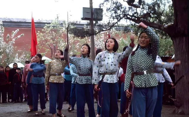 这个露天的地方叫工人公园的露台,树影斑驳,旗子在枝叶间穿梭,姑娘们穿的是碎花棉布上衣配蓝裤子,腰间束着窄皮带,手里举着道具一挥一抡,吭哧吭哧就把队形拼起来了,口号打头,合唱在后,唱到高处胸腔那股劲儿顶出来,声音透着股铁一样的亮,奶奶看这类照片总是笑,她说那会儿衣裳不多样,可人精神头足,排练完了还要把场地清了,扫把一拉,边聊边扫,回家再把衣服在水泥池边搓两把,挂在门口的竹竿上,第二天继续上场。