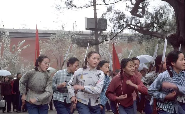 这张里动作更猛,领操的人一招一式抡得利索,脚下半弓步,拳头从腰间抽出来,嗖一下就到面前,旁边人神情紧着,队列里偶尔有人喊错拍,后边的小伙伴笑一声又憋回去,春天的风一吹,梨花一树一树白起来,花瓣落在肩上也不管,继续走组合,直到鼓点收住才散,小时候在院里我们学着做这些动作,鞋底在水泥地上蹭出“咝咝”的声,学不了几招就累得喘粗气。