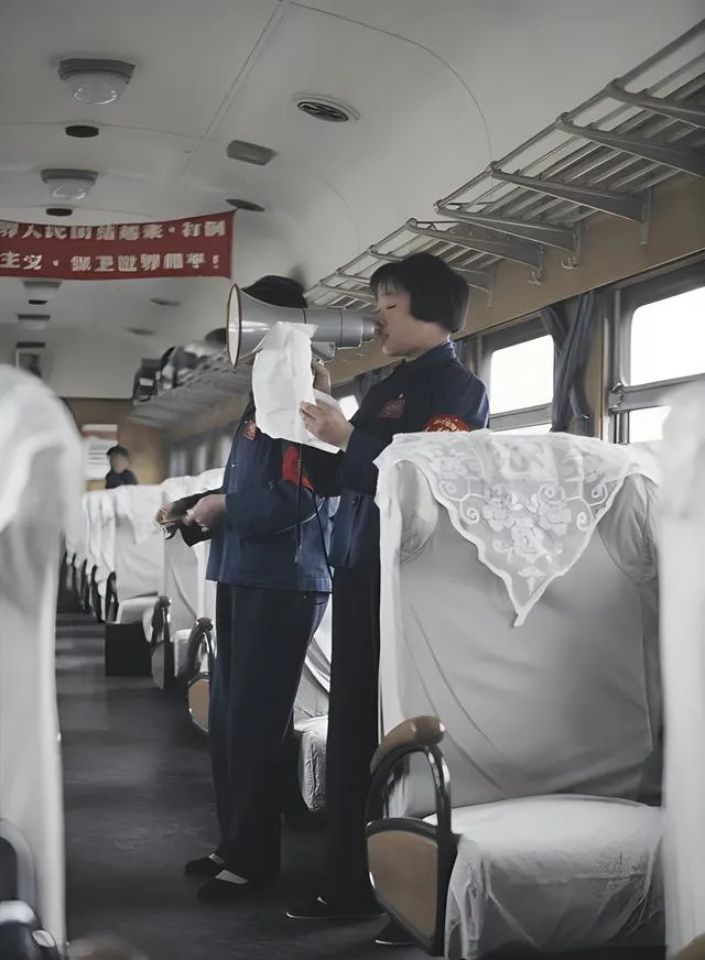 这个干干净净的车厢叫涉外软座,靠背套上铺着抽纱,边沿用卷曲的花边压住,手一摸是凉的,列车员举着电喇叭站在过道里,另一只手攥着纸条,照着念口号,车顶行李架是铝制的,横杆一道一道,窗外晃过去的树影被玻璃抹成绿色的带子,妈妈说那会儿坐上这样的车,心里就咯噔一下觉得正式了,站姿得立正,说话也不敢大声,连茶杯都端得稳稳的,生怕撒在座套上。